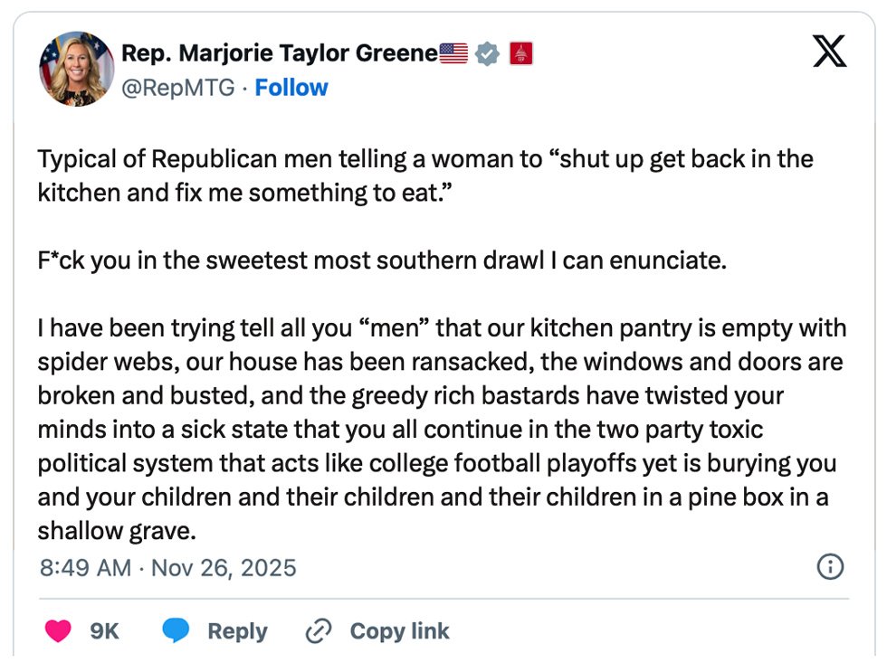 Rep. Marjorie Taylor Greene has never been shy about torching her critics, but her latest eruption — aimed squarely at Republican men — landed like a grenade tossed into her own party.