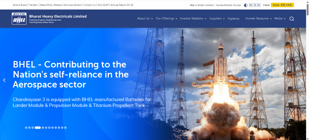 BHEL is a government-owned company. The firm was established to support self-reliance in heavy engineering. It emphasises power generation equipment and leads the energy sector of India. Mechanical engineers at BHEL are responsible for designing and fabricating huge turbines, boilers and generators used in power plants. The company also makes transmission systems and industrial machinery.