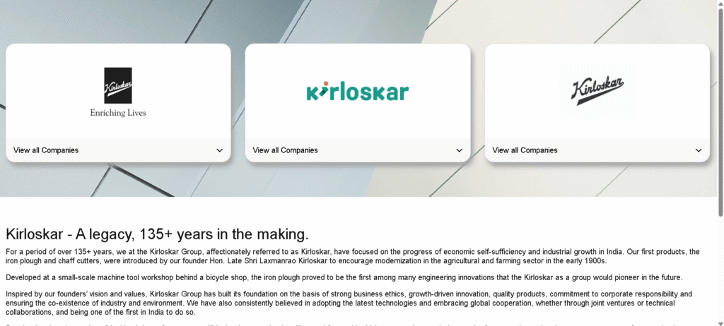 Kirloskar is one of India’s oldest engineering conglomerates. It began with agricultural tools and grew into mechanical engineering. They specialise in handling fluids, designing diesel generators, and irrigation systems for agriculture and industry. The Kirloskar Group provides reliable and affordable services.